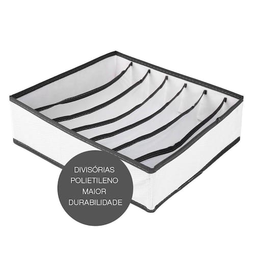 O Organizador Classic 7 Divisórias Branco Cinza é ideal para quem deseja otimizar o espaço e a organização de armários e closets, com 7 nichos separadores, permite uma visualização e escolha mais rápida das suas peças. É a solução perfeita para organizar roupas íntimas, camisolas, pijamas e etc. Tamanho do Organizador: 33x21x9cm
