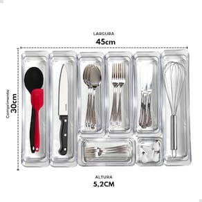 O nosso organizador de talheres é perfeito para deixar a gaveta de sua cozinha mais prática e eficiente, pois ele possui 8 compartimentos sendo que 3 deles é ideal para guardar utensilio maiores, sua estrutura é toda feita em acrílico tornando-o muito mais rígido e de ótima qualidade.