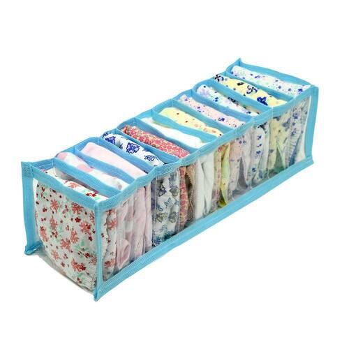 Ideal para meias, calcinhas, cuecas, luvas, lenços, sapatinhos de bebe, chaves, 11 nichos em cada organizador 10x10x30cm Características Material: pvc transparente com Viés em TNT azul Características Gerais Cor: Transparente