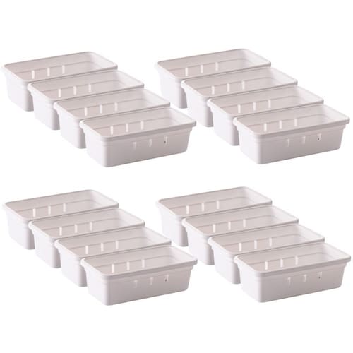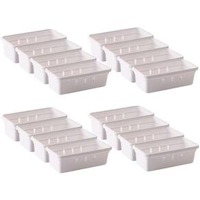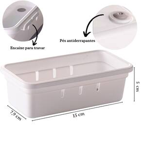 Conjunto com 16 unidades. Organizador de gavetas e talheres plástico 15,0 x 7,9 x 4,5 cm. Possuem encaixes com clique que realmente prendem uma peça na outra. Podem ser reorganizados conforme a sua necessidade. Todas as peças contam ainda com pés antiderrapantes evitando que deslizem com o movimento da gaveta. São perfeitos para organizar talheres, material de escritório, ferramentas, material de costura, maquiagens e todas aquelas bugigangas que ficam misturadas nas gavetas. Material: polipropileno Comprimento: 15,0 cm / Largura: 7,9 cm / Altura: 5 cm