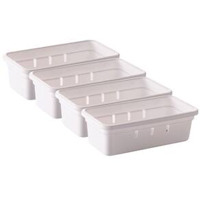 Conjunto com 4 unidades. Organizador de gavetas e talheres plástico 15,0 x 7,9 x 4,5 cm. Possuem encaixes com clique que realmente prendem uma peça na outra. Podem ser reorganizados conforme a sua necessidade. Todas as peças contam ainda com pés antiderrapantes evitando que deslizem com o movimento da gaveta. São perfeitos para organizar talheres, material de escritório, ferramentas, material de costura, maquiagens e todas aquelas bugigangas que ficam misturadas nas gavetas. Material: polipropileno Comprimento: 15,0 cm / Largura: 7,9 cm / Altura: 5 cm