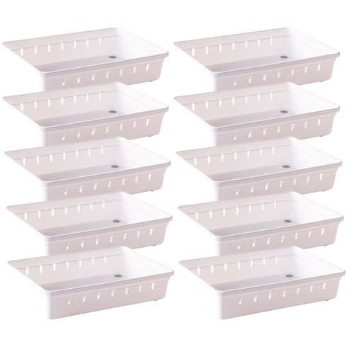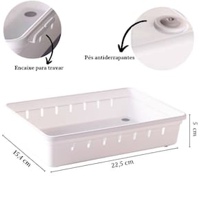 Conjunto com 10 unidades. Organizador de gavetas e talheres plástico 22,5 x 15,4 x 4,5 cm. Possuem encaixes com clique que realmente prendem uma peça na outra. Podem ser reorganizados conforme a sua necessidade. Todas as peças contam ainda com pés antiderrapantes evitando que deslizem com o movimento da gaveta. São perfeitos para organizar talheres, material de escritório, ferramentas, material de costura, maquiagens e todas aquelas bugigangas que ficam misturadas nas gavetas. Material: polipropileno Comprimento: 22,5 cm / Largura: 15,4 cm / Altura: 5 cm