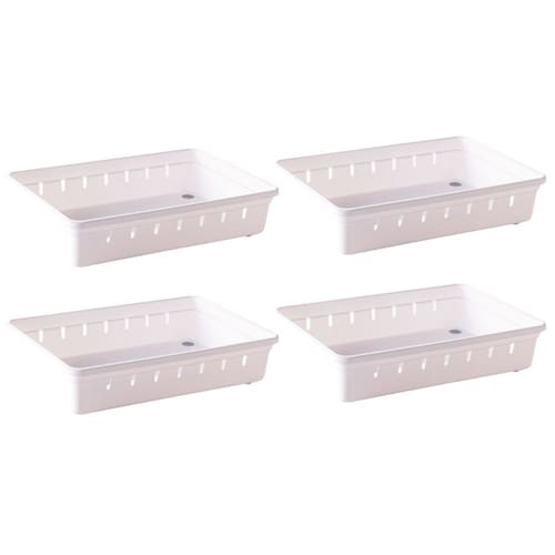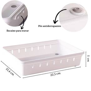 Conjunto com 4 unidades. Organizador de gavetas e talheres plástico 22,5 x 15,4 x 4,5 cm. Possuem encaixes com clique que realmente prendem uma peça na outra. Podem ser reorganizados conforme a sua necessidade. Todas as peças contam ainda com pés antiderrapantes evitando que deslizem com o movimento da gaveta. São perfeitos para organizar talheres, material de escritório, ferramentas, material de costura, maquiagens e todas aquelas bugigangas que ficam misturadas nas gavetas. Material: polipropileno Comprimento: 22,5 cm / Largura: 15,4 cm / Altura: 5 cm