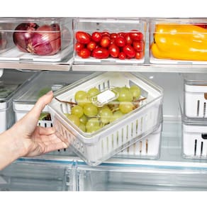 Organizador De Geladeira Com Cesto Escorredor 2,2L Organizador Clear Fresh Para Legumes OU. #Com respiradouro e cesto de drenagem #Organizador de geladeira transparente #Linha Clear Fresh OU Garantia: 90 Dias / Peso: 322g / Cores: Natural e branco / Ref: OF450NT Dimensões: 20cm (C) x 15cm (L) x 9,5cm (A) Dimensões internas: 18,5cm (C) x 14cm (L) x 9cm (A) Dimensões do cesto: 19cm (C) x 14cm (L) x 8cm (A) Capacidade: 2,2 Litros. Limpeza e cuidados: - Lavar com água e sabão neutro utilizando esponja macia, seguido de pano seco; - Não utilizar produtos químicos ou abrasivos na limpeza; - Não suporta máquina de lavar; - Evitar batidas. Detalhes do produto: - A tampa com respiradouro ajustável mantém o nível de umidade ideal para cada tipo de alimento, mantendo-os frescos por mais tempo; - Possui cesto de drenagem que evita que os alimentos fiquem molhados após a lavagem, ajudando a prevenir a deterioração precoce; - O cesto de drenagem dispõe de alças laterais que facilitam o transporte e manuseio; - Possui total transparência para você enxergar o conteúdo e manter tudo em ordem; - Não suporta micro-ondas; - Livre de bisphenol A; - Não suporta freezer; - Suporta geladeira; - Empilhável. Materiais: - Polipropileno (PP); - Poliestireno (PS). Uma geladeira organizada é uma geladeira que além de caber tudo direitinho, você consegue visualizar todos os alimentos. Assim, você evita desperdícios e mantém tudo em ordem. E o organizador de geladeira com cesto de drenagem da linha Clear Fresh vai te ajudar nisso! Com um design minimalista, transparente e fácil de limpar, você organiza os espaços com mais funcionalidade e praticidade. O seu cesto escorredor é ideal para frutas, legumes e folhas, permitindo que a água armazenada escorra para o fundo do organizador e não fique em contato com os alimentos, evitando o ressecamento e deterioração precoce.