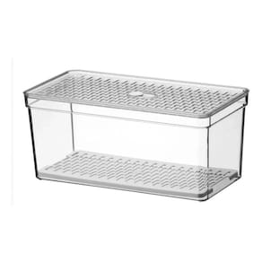 Organizador de geladeira grande frutas legumes com grade ========== sobre o produto ========== O organizador de geladeira grande frutas legumes é a solução ideal para manter seus alimentos frescos e organizados por mais tempo. Com um design inteligente, ele conta com uma grade removível que permite melhor circulação de ar, evitando o acúmulo de umidade e prolongando a vida útil de frutas, legumes e verduras. Feito em plástico transparente de alta qualidade, ele facilita a visualização do conteúdo, ajudando a otimizar o espaço da geladeira e mantendo tudo ao seu alcance de forma prática e higiênica. Este organizador é essencial para quem busca eficiência na cozinha e quer garantir mais frescor aos alimentos. ========== especificações ========== Grade removível, que facilita a ventilação e evita o acúmulo de umidade. Ideal para armazenar frutas, legumes e verduras com segurança. Material plástico transparente de alta durabilidade, fácil de limpar. Design grande e prático, otimiza o espaço interno da geladeira. ========== ficha técnica ========== Medidas: 30,5 x 15,5 x 13,5 cm Material: poliestireno ps + polipropileno pp Marca: crippa : 3 meses Estamos online para quaisquer dúvidas, Agradecemos e aguardamos o seu pedido. P: o grade é removível para facilitar a limpeza R: sim, o cesto é removível, facilitando a limpeza e ventilação dos alimentos. P: posso armazenar outros tipos de alimentos além de frutas e legumes R: sim, o organizador é versátil e pode ser para diversos alimentos, como queijos, frios e embutidos. P: é seguro para contato com alimentos R: sim, o material plástico é seguro para armazenar alimentos e fácil de higienizar. P: o produto é novo ou