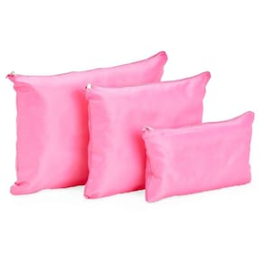 Kit composto de 3 unidades com: alça para transporte, zíperes com pegadores emborrachados, parte frontal com malha de nylon e plaquinha emborrachada para personalização e 3 unidades de necessaires em nylon lisas e impermeáveis;