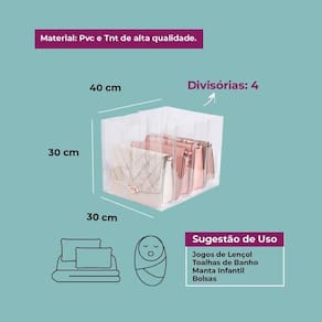 Chega de bagunça Este organizador multiuso é ideal para mantas, toalhas, lençóis e até roupas delicadas de bebê. Produzido com material resistente, é dobrável, fácil de limpar e otimiza o espaço do seu armário ou cômoda.