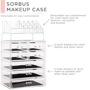 Sorbus Acrílico Cosmetics Estojo de armazenamento de maquiagem e joias Display conjunto - MAKE UP ORGANIZERS AND STORAGE - Organize all your beauty products, cosmetics and accessories in the easy-to-use makeup organizer for vanity. Enjoy a dazzling personalized makeup storage and cosmetics organizer (No Assembly Required). - SLEEK & STYLISH - Chic and elegant exterior - Its clear style creates easy visibility and appealing display that coordinates beautifully with most décor - Makeup case is a great gift for any girl, teen, adult, beauty, fashion and makeup lover. - DISPLAY & STORE BEAUTIFULLY - Makeup storage organizer suits lipstick, mascara, foundation, bronzer, blushes, eyeshadow, nail polish, primer, powders and even a small mirror - Can also be used to store jewelry, personal accessories, grooming tools, keepsakes, and much more - Fits on most dressers, bathroom vanity desks, and counter tops. - FUNCTIONAL & CONVENIENT - Keep makeup and accessories neat and organized for easy access - Reduce clutter, save time getting ready, and save space - Convenient detachable slot compartments on the top level keeps items protected, upright, visible and in place, for extra convenience. - DURABLE & LONG-LASTING - Made of durable acrylic-like clear plastic - Includes 3 large drawers, 4 small drawers and 16 slot compartments - Drawers slide open smoothly with easy grip handles - Can also be used to complement other organizers by Sorbus - Measures approximately 9.25” L x 6.25” W x 14.25” H (drawers 1.87” deep)