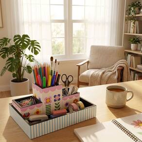 Organizador de mesa em MDF e acabamento interno em material aveludado preto. Contém: uma bandeja medidas: 23 cm (comp.) x 16 cm (larg.) x 4 cm (alt.); 2 porta-clips medidas: 7 cm (comp.) x 7 cm (larg.) x 5,0 cm (alt.) e 1 porta-lápis medidas: 7 cm (comp.) x 7 cm (larg.) x 10 cm (alt.).