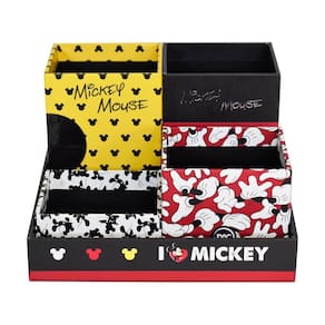 O organizador de mesa do mickey é perfeito para deixar tudo organizado no seu cantinho, seja ele de estudos, de trabalho ou de leitura e reflexão pessoal. Com ele você organiza pequenos objetos que ficam perdidos ou espalhados pela mesa, todo material de escrita (canetas, lápis, marca textos e afins), bloquinhos de rascunho para anotações, clips, borrachas e outros itens, até como suporte para o celular dá para usar. Além disso, enfeita sua mesa com muito charme e estilo, são 4 caixinhas que se encaixam e desencaixam perfeitamente em sua base para você montar e usar do seu jeito. Todas com forração interna e estampas variadas do ratinho mais querido e carismá tico do mundo. Descrição do organizador de mesa código: 3425 categoria: organizador de mesa cor: estampado formato: 23,7 cm x 18,2 cm x 3,4 cm quantidade: unitário composição: papel cartonado detalhes: com 4 caixinhas avulsas para montar dentro da bandeja, acabamento em verniz localizado e hot stamping.