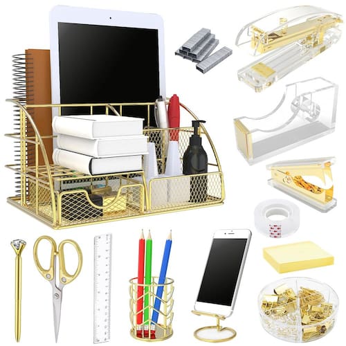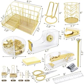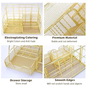 Nosso organizador de mesa bonito e elegante possui 5 compartimentos separados e 1 mini gaveta deslizante. - Elegante e prático – Nosso conjunto de organizadores de mesa e materiais de escritório permite que você lide facilmente com vários trabalhos de escritório. A aparência elegante dos organizadores de mesa e acessórios torna a mesa mais bonita e o trabalho não é mais monótono. - O pacote inclui: nosso conjunto de materiais de escritório contém 13 itens, incluindo organizador de mesa, grampeador, removedor de grampos, tesoura, suporte de telefone, caneta, suporte de caneta, dispensador de fita, etc. - Bom acabamento - Nossos materiais de escritório e acessórios são feitos de metal de alta qualidade, e o processo de coloração de galvanoplastia garante que os produtos não desbotem após o uso prolongado. Lixamos as bordas com cuidado para garantir que não haja rebarbas para arranhar o usuário. - Economiza espaço – Nosso organizador de mesa pode ser utilizado em vários cenários, como escritório, casa e escola. Além do espaço projetado para notebooks e tablets, também projetamos uma gaveta para você colocar alguns pequenos acessórios. - Se houver algum problema com o produto, sem hesitação. Nós responderemos dentro de 24 horas.