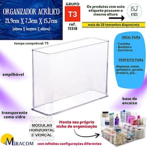 O organizador é produzido em poliestireno transparente e suas medidas, em centímetros, são as seguintes: