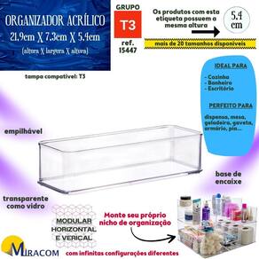 Dimensões e combinações milimétricas: Os tamanhos (comprimento e profundidade) dos organizadores formam um padrão único no mercado porque são produzidos com intervalos de 7,3cm, ou seja, são múltiplos de 7,3cm, o que faz com que formem um nicho perfeito com diferentes espaços de organização em um só lugar, dependendo da sua necessidade. Basta definir o espaço que deseja organizar e escolher o tamanho de cada caixa organizadora para formá-lo. Próprio para organização de objetos de diversos tamanhos.