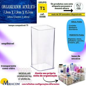 O organizador é produzido em poliestireno transparente e suas medidas, em centímetros, são as seguintes: