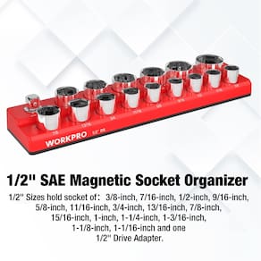WORKPRO Organizador de soquete magnético DR. SAE de 1,27 cm (1/2") - Organizador de soquete magnético de grande capacidade: este organizador de soquete magnético pode armazenar até 19 soquetes SAE. Ele coleta receptáculos SAE, mas não para soquetes de impacto. Dica: os soquetes não estão incluídos com os suportes - Base magnética: a base magnética prende os soquetes em seus locais designados. Eles não cairão mesmo se você virar a bandeja de soquete de cabeça para baixo. Eles também permitem que você prenda a bandeja em qualquer superfície de aço - Instalação sem arranhões: a superfície da base magnética é composta de borracha macia, então não há necessidade de se preocupar em arranhar a superfície de suas ferramentas e soquetes de metal, o ajuste perfeito para o seu conjunto de ferramentas - Mantenha seus soquetes organizados: encontre o soquete certo de forma rápida e fácil com este suporte de soquete magnético. Cada bandeja tem uma etiqueta legível, para que você possa dizer qual compartimento pegar em vez de encontrar o soquete que deseja em uma caixa de ferramentas desorganizada como antes - Adequado para soquetes de tamanho padrão: o organizador de soquete magnético de 1,27 cm foi projetado para armazenamento seguro de soquetes e adaptadores SAE padrão, coloque todos os seus soquetes corretamente. Você pode colocar seus soquetes em qualquer lugar, como em uma gaveta montada na lateral da sua caixa de ferramentas para que você possa acessá-los a qualquer momento. Dicas: O conjunto organizador de soquete não é adequado para armazenar soquetes de impacto