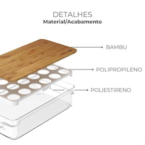 Feito com matéria-prima de alta qualidade, o Organizador de Ovos possui estrutura em bambu, que confere resistência e durabilidade ao produto. Além disso, a tampa em bambu proporciona um toque de elegância e sofisticação.