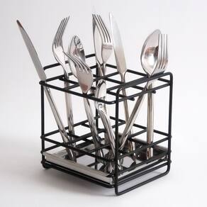 Organizador de talheres cód. 2443 Medidas: 140x150x135mm Características: Com divisores fixos para organizar talheres Material: bandeja em inox estrutura em aço carbono Acabamento: pintura preta Insumos que acompanha: 01 bandeja em inox Garantia: 12 Meses