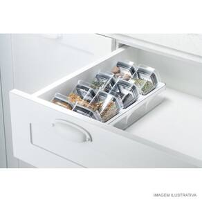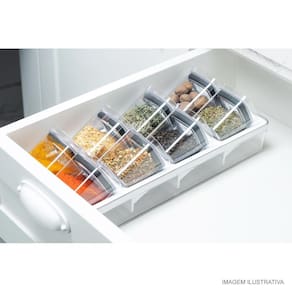 A Linha Clear é a união entre transparência e organização que independente do ambiente, promove um design perfeito para organizar e aumentar o espaço das suas gavetas. O Organizador de Tempero Clear com 8 Peças Branco OU foi pensado para permitir diversas composições e proporcionar máximo aproveitamento de espaço nas gavetas, por isso, possui inclinação de 25° que facilita e visualização dos temperos, além de comportar 8 potes de 150mls. Combine, encaixe e enxergue facilmente o conteúdo, mantendo tudo em ordem. Produzido em material resistente (Plásticos PP + PS + silicone) que proporciona alta transparência, fácil higienização e praticidade na hora de organizar. A linha Clear é indispensável para auxiliar você na organização da sua casa.Código de Barras:7908466020811 Referência:COB1400BCF Marca: OU Composição/Material:Plásticos PP, PS e Silicone Dimensões aproximadas do produto (cm):11,5x15x37,6 cm Peso aproximado do produto (kg):0.784 kg