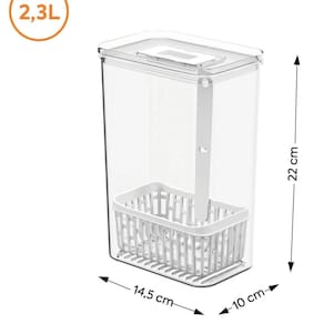 Garantia: 90 dias / Peso: 356g / Cor predominante: transparente / Referência: 101883009; Dimensões: 15cm (C) x 10cm (L) x 22cm (A); Capacidade: 2,3L; Conteúdo: 1 organizador de geladeira com cesto removível; Materiais: polietireno terflatato (PET) e polipropileno, livre de BPA.