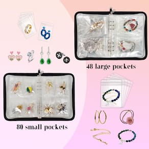 O pacote inclui dois livros transparentes de armazenamento de joias, 80 grades (10 páginas internas) com 80 bolsas pequenas (tamanho: 6 x 8 cm) e 48 grades (12 páginas internas) com 48 bolsas grandes (tamanho: 9 x 13 cm). - ?Armazenamento classificado e design que economiza espaço?Este organizador de joias é perfeito para aqueles que querem economizar espaço enquanto mantêm suas joias organizadas e facilmente acessíveis. Com este livro de armazenamento de joias transparente, é fácil ver o que está dentro sem precisar de uma etiqueta ou retirá-lo, comporta brincos, anéis, colares, pulseiras e outros itens de joias de maneira limpa e ordenada. Facilita encontrar o que você precisa rapidamente e evita que suas joias se misturem e se enrolem. - ?Grande capacidade?O pacote inclui dois livros de armazenamento de joias transparentes, 80 grades (10 páginas internas) com 80 bolsas pequenas (tamanho: 6 x 8 cm) e 48 grades (12 páginas internas) com 48 bolsas grandes (tamanho: 9 x 13 cm) ). Projetada com uma tira de vedação côncava-convexa, esta bolsa autovedante tem um bom desempenho de vedação, fácil de fechar e abrir. Feita de material de PVC espesso, resistente a arranhões e confiável de usar, impermeável, antioxidante e antimanchas. - ?Design flexível de folhas soltas para aumentar ou diminuir?Ótimo para armazenamento de joias planas. Se você quiser colocar algumas joias grandes e grossas, você pode reduzir algumas páginas internas adequadamente para evitar que o zíper do fichário não feche corretamente. O fichário de metal com design de folha solta de 6 furos permite que você adicione ou remova páginas internas de acordo com suas necessidades, facilitando a organização de diferentes tipos de joias, dependendo do tamanho e da forma. - ?Estojo de joias portátil para viagem?O fichário é projetado com um fecho de zíper de alta qualidade que mantém suas joias no lugar e evita que elas caiam. Compacto e leve. É perfeito para colocar em sua mala ou bolsa noturna se você quiser carregar quando estiver viajando ou ficando longe de casa! - ?Presente perfeito? álbum de joias especialmente projetado para mulheres e meninas adolescentes. É ótimo para sua namorada, esposa, mãe, filha, irmã como presente de aniversário, dia dos namorados, dia das mães, formatura, aniversário, Natal etc.