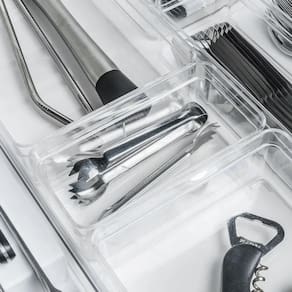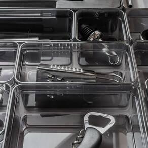Organizador Gavetas Modular Maquiagem Cozinha Escritório Ou Cor: Fumê Organizador gavetas linha Clear Ou despachamos em até 24h após o pedido qualidade altíssima A Linha Clear é a união entre transparência e organização que, independente do ambiente, promove um design perfeito para organizar e aumentar o espaço das suas gavetas. Produzido em material resistente que proporciona alta transparência, fácil higienização e praticidade na hora de organizar. - Ficha técnica: Marca: Ou Linha: Clear Medidas: 5,6 x 7,5 x 15cm A x L x P Peso: 64g Material: plástico Acabamento: transparente - Cuidados com o produto: Este produto é BPA Free, não deve ser levado ao freezer ou ao microondas. Sugere-se higienizar o mesmo com sabão neutro e esponja macia, evitando produtos abrasivos no processo de limpeza. Imagens ilustrativas