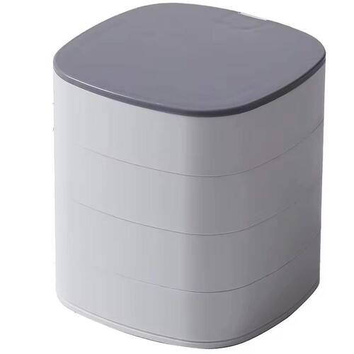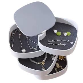 Material abs, que é resistente ao desgaste e durável. Empilhamento de quatro camadas, armazenamento classificado. Cubra com feltro para evitar que a joia arranhe. Pés antiderrapantes, colocação estável. Forma cilíndrica, pode girar 360 graus. Organizador giratório 4 andares com espelho p maquiagem jóias
