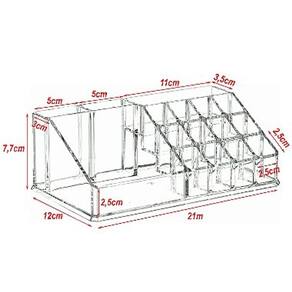 • Cantos arredondados para evitar arranhões • Com 12 divisórias pequenas, 3 médias e 1 grande para organizar vários batons e makes. • Lavável (Evite o uso de substâncias abrasivas ou solventes, como álcool ou tíner, que danificam o produto). • Já vem pronto para uso, não precisa de montagem.