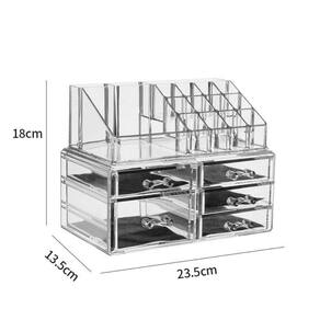 Design Transparente e Sofisticado ? Facilita a visualização dos itens, combinando com qualquer ambiente. Amplo Espaço de Armazenamento ? Possui 5 gavetas espaçosas para guardar produtos maiores e 16 divisórias ideais para batons, lápis e pequenos acessórios. Versatilidade no Uso ? Pode ser utilizado como uma única peça ou separado em duas partes para melhor adaptação ao seu espaço. Ótima Opção para Presente ? Perfeito para quem ama maquiagem e deseja manter tudo sempre organizado.
