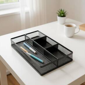 Com quatro divisórias, ele permite organizar diversos itens como canetas, lápis, clipes, blocos de nota, e outros acessórios de papelaria, facilitando o dia a dia e otimizando seu tempo.