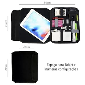 Dimensões: 29cm x 23cm (Fechado) e 54cm x 28cm (Aberto), compartimento parte interna: 24cm