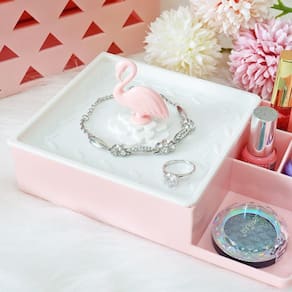 O Organizador Multiuso Flamingo da Jacki Design é um item indispensável para a sua penteadeira. Possui vários compartimentos e uma tampa que serve como espelho. Ideal para guardar makes, bijus e acessórios! MODO DE USAR: Apoie o flamingo no organizador, e ele vira um suporte para o espelho!