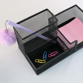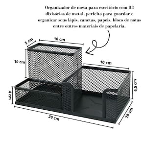 Esse organizador é super prático e manterá sua mesa sempre organizada, tanto em casa como no trabalho. Contém 3 divisórias para organizar seus lápis, canetas, marca textos, como também blocos de notas e clips.