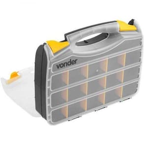Organizador Plastico 315 x 255 x 80 MM OPV 222 VONDER Possui 32 compartimentos com 24 divisões removíveis e adaptáveis, alça para transporte e 4 travas.Indicado para acondicionar peças e acessórios, material de pesca, parafusos, pregos, porcas, remédios, entre outros. Modelo:OPV 222 Material:Polipropileno Comprimento:31,5 cmLargura:25,5 cmAltura:8,0 cmCapacidade de carga kgf :5 kgfCor do organizador para ferramentas:Preto/amarelo e transparenteMassa aproximada peso :0,8 kg Imagens Meramente Ilustrativas