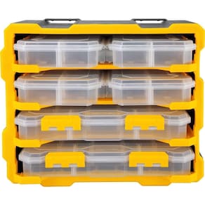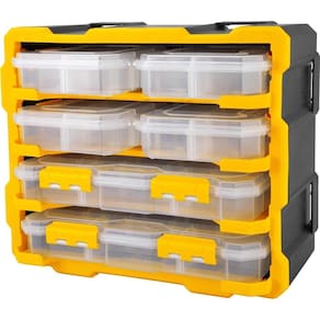 Conteúdo da Embalagem: 1 Organizador plástico. Possui 6 caixas organizadoras, sendo 4 caixas com 6 compartimentos e 2 caixas com 13 compartimentos, todos com divisórias removíveis e adaptáveis. Pode ser utilizado em cima de bancada ou fixado na parede. Permite ser acoplado nos Organizadores Plásticos OPV 009 (61.08.000.009) e OPV 090 (61.08.000.900) (não acompanham). Indicado para guardar e organizar peças e acessórios em geral. Modelo:OPV 099 Material:Polipropileno Comprimento:380 mm Largura:180 mm Altura:320 mm Capacidade de carga (kgf):12 kgf Massa aproximada (peso):2,4 kg