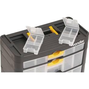 Conteúdo da Embalagem: 1 Organizador plástico. Possui alça para transporte, 3 gavetas e 2 compartimentos externos. Indicado para organizar e armazenar peças e acessórios em geral. Modelo:OPV 400 Material:Polipropileno Comprimento:400 mm Largura:200 mm Altura:285 mm Capacidade de carga (kgf):9 kgf Cor do organizador para ferramentas:Preto e transparente Massa aproximada (peso):2,39 kg