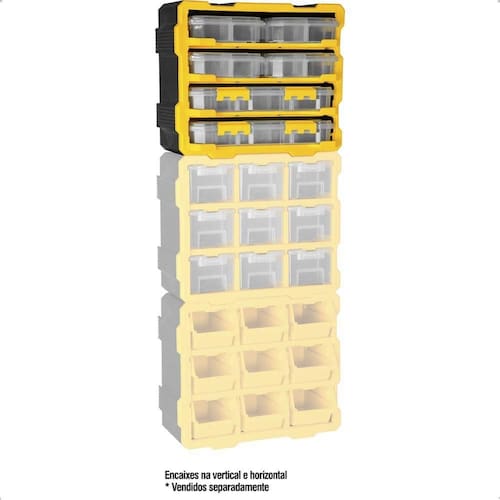Este modelo conta com 6 caixas organizadoras removíveis, sendo 4 com 6 compartimentos e 2 com 13 compartimentos, totalizando um excelente espaço interno. Todas as divisórias são removíveis e adaptáveis, o que permite customizar o layout conforme o tipo e tamanho dos itens armazenados ? ideal para parafusos, buchas, terminais elétricos, acessórios de pesca, peças de eletrônica e muito mais.