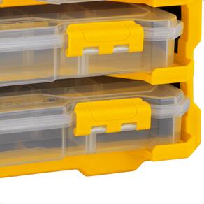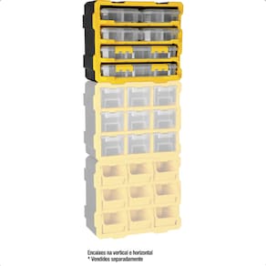 Este modelo conta com 6 caixas organizadoras removíveis, sendo 4 com 6 compartimentos e 2 com 13 compartimentos, totalizando um excelente espaço interno. Todas as divisórias são removíveis e adaptáveis, o que permite customizar o layout conforme o tipo e tamanho dos itens armazenados ideal para parafusos, buchas, terminais elétricos, acessórios de pesca, peças de eletrônica e muito mais.