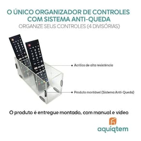 Organizador Porta Controle Remoto Mesa Premium Acrílico Luxo Porta controle remoto de acrílico cristal premium. Suporte para Controle Remoto de TV ou Ar Condicionado em Acrílico Cristal. O suporte porta controle é perfeito para organizar sua sala ou seu escritório, colocando todos os controles no mesmo lugar. Além de organizar vai decorar o ambiente com com design moderno e acabamento premium .. O porta Controle é produzido em acrílico cristal Premium, tem estilo moderno e é de encaixe , fazendo com que deixe o produto com ar elegante , além disso o produto não quebra , caso ocorra uma queda brusca ele vai apenas desencaixar, diferente das outros porta controles do mercado , que são coladas e certamente quebram na queda .... Capacidade para 4 controles que não acompanham o porta controle. Tamanho: Altura: 8cm Comprimento: 20 cm Largura: 8cm Marca: Aquiqtem