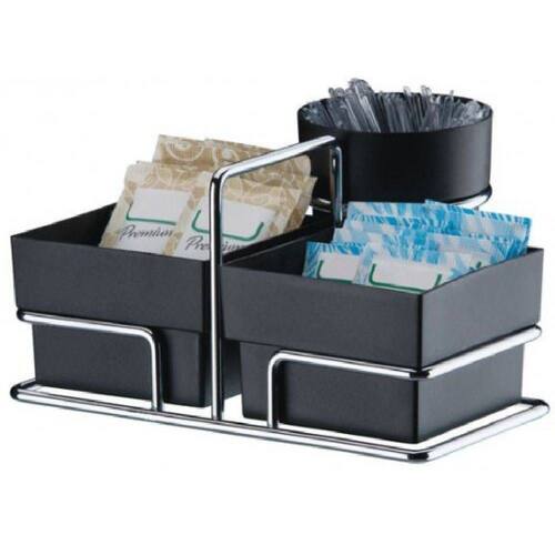 Prático e versátil esse organizador para sachês de açúcar, adoçantes e mexedores Deixe seu ambiente do café mais organizado proporciona facilidade e organização para sua empresa, consultório, para eventos, coffee break Produzido em aço cromado de alta resistência e qualidade , potes em polipropileno Preto Seu formato faz com que seja possível aproveitar uso pequeno espaço Possui fácil sistema de instalação Pois não se faz necessário o uso de parafusos ou ferramentas, Garantia de 5 anos do fabricante Tecnologia Rust Free , contra ferrugem, cromagem com mais brilho Fotos meramente ilustrativas , não acompanha acessórios Ean: 7896497809997