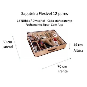 Organizadora de Sapato Chinelo Sandália Tênis 48 Pares com Capa - 4 Unidades de 12 Pares Essa sapateira é um ótimo organizador de Sapatos, Chinelos, Sandálias, Tênis, Sapatênis, dentre outros. Pode ser guardado debaixo da cama e também no guarda- roupa. A cor Marfim, tem capa transparente, facilitando a visualização das peças. As medidas de cada sapateira flexível organizadora são: 14 cm  Altura  x 60 cm  Largura  x 70 cm  Comprimento . A capacidade de cada sapateira é de 12 pares. Essa Sapateira Flexível é o jeito mais fácil, prático e moderno para você guardar seus Sapatos, Chinelos, Sandálias, Tênis, Sapatênis, dentre outros, sem perder tempo. Ela guarda, protege, tem capa e otimiza os espaços. Feito com PVC e TNT reforçado, é um produto de excelente qualidade e durabilidade. Produto flexível e resistente. Ela possui fechamento em zíper, protegendo os seus sapatos e aumentando a durabilidade deles. Dica: Organize os pares em cada nicho, limpos. Para melhorar a organização, separe seus calçados por categorias: tipo, cor, ocasião de uso, marca, a fim de facilitar o seu dia a dia. A Sapateira Flexível 12 pares pode ser guardada no chão, debaixo da cama, no guarda-roupa ou na cômoda. Se desejar, coloque uma sapateira sobre a outra para ganhar mais espaço. Organize-se e ganhe mais praticidade em sua vida Características e Benefícios: - Marca: VB Home - Tamanho: 60 x 70 x 14 - Cores: Marfim - Material: PVC e TNT - Capacidade: 12 Divisórias em cada Sapateira - Material Resistente e Reforçado - Capa Transparente, o que facilita a visualização das peças - Prático e Compacto, utilize na sua casa ou para viagens - Organiza seus calçados de forma fácil - Otimiza espaço e tempo - Fechamento com Zíper Embalagem: 4 Un Sapateira Esse Kit vem quantas unidades R.: Esse Anúncio é de 4 Unidades do Organizador, caso queira mais, temos Kit's com 1, 2, ou 4 Unidades. Envie mensagem no campo de Perguntas que direcionamos o anúncio ideal para você. O Produto é Novo ou Conheça a linha de colmeias organizadoras de gavetas, perfeitas para maior organização de seu armário e closets. Temos organizadores de vários tamanhos, na dúvida consulte-nos. Estamos à sua disposição Sapateira Organizadora Flexível Pares Gaveta Guarda Roupa Armário Closet Cômoda Rack Quarto Sapatos Tênis Sapatênis Social Salto Chinelo Calçados Otimizar Espaço Personal Organizer