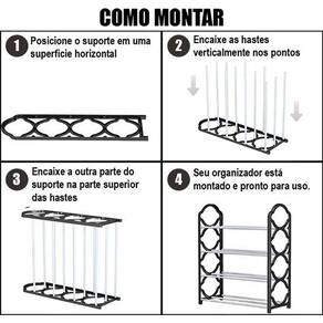 Este modelo possui estrutura lateral em plástico resistente e 12 hastes de aço que conectam as laterais, formando quatro andares espaçosos. Cada andar é montado com três hastes, garantindo estabilidade e espaço suficiente para acomodar diversos tipos de calçados. Sua montagem e desmontagem simples a tornam ideal para mudanças e adaptações, permitindo que você transporte ou reposicione conforme a sua necessidade.