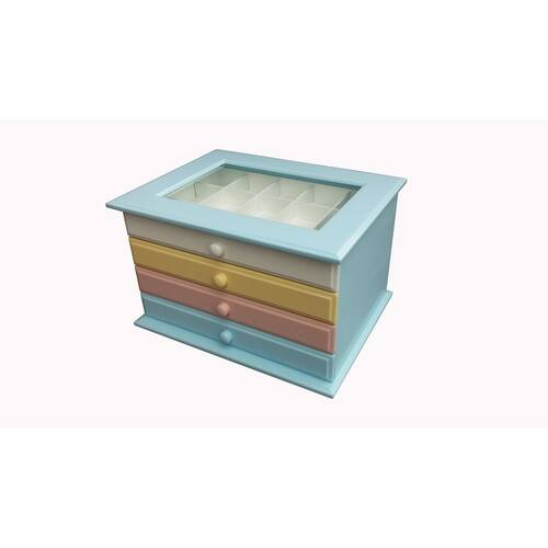 Nossos organizadores irão facilitar seu dia a dia com a organização e segurança que sua coleção precisa, além de proporcionar um ambiente mais sofisticado e elegante para qualquer idade. Produzida com MDF. A parte superior do gaveteiro, a tampa, possui visor com vidro transparente de 2 mm. Laqueado por fora e colorido por dentro podendo trocar de posição as suas gavetas. As gavetas tem divisórias diferenciadas de acordo com que você queira guardar, podendo guardar jóias, relógios, pulseira, anel, brinco e etc. Características do Organizador: - Cor externa, Colorido Laqueado , - Cor externa, Azul Laqueado , - Tampa de vidro 2 milímetros, - 4 gavetas com divisórias diferenciadas internas, - Tamanho do Organizador, 34X26X21, Relógios e jóias não acompanham o organizador - Imagens meramente ilustrativas
