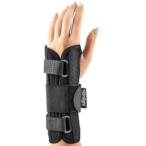 - Possui 2 talas não removíveis, a superior em alumínio e inferior em PVC, com ângulo de 45º. Além disso, possui ajuste com fecho aderente no polegar. A tira do meio é em elástico com três fechos aderentes e fica posicionada bem em cima da articulação, reforçando a imobilização.