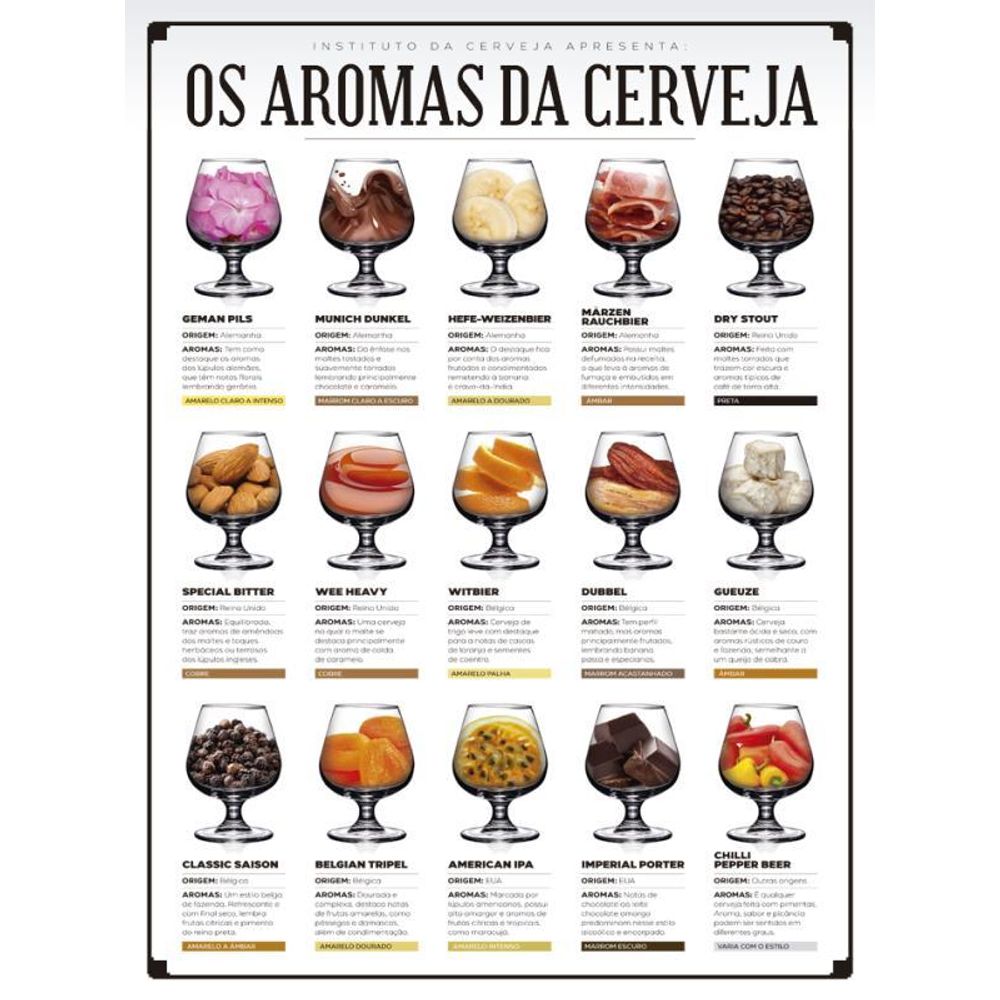 Um guia visual para você entender e degustar melhor sua bebida favorita. Criado pelo Instituto da Cerveja Brasil e Editora Europa. Traz um pôster gigante ilustrado, que pode decorar e ensinar sobre os mais famosos e importantes aromas da cerveja no Brasil e no Mundo. Impresso em papel fotográfico e quando aberto tem 84 x 59cm. Formato 84 x 59cm