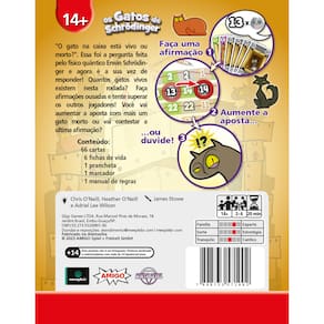 A incerteza não matou o gato, mas isso não significa que ele não está morto. Dr. Erwin Schrödinger e Werner Heisenberg nos ensinaram isso. Todos nós já ouvimos sobre os experimentos de gatos em caixas e talvez até tenhamos curiosidade sobre os resultados – mas tentar essa experiência seria insano na vida real! Os Gatos de Schrödinger é um jogo divertido que brinca com a ideia da física quântica e os paradoxos do gato de Schrödinger! A cada rodada, cada jogador tenta determinar o número mínimo de gatos vivos, gatos mortos ou caixas vazias em todas as caixas no laboratório de Schrödinger. Você aposta em certas possibilidades, usando regras simples: escolha cartas que alteram o estado do seu gato, mas cuidado, pois tudo pode não passar de um blefe! Até você observar (revelar) o resultado final, tudo ainda pode estar em dois estados ao mesmo tempo, criando um clima de incerteza divertido e cheio de suspense. O vencedor é quem conseguir controlar melhor essas possibilidades, chegando mais perto de alcançar seus objetivos e “colapsar” a incerteza a seu favor. Quer se divertir pensando e jogando de forma criativa? Então, “Os Gatos de Schrödinger” é perfeito para experimentar conceitos científicos de uma maneira leve e cheia de risadas. Prepare-se para criar múltiplas realidades ao mesmo tempo e descobrir que, no mundo quântico, tudo pode acontecer! Está pronto para colocar sua intuição à prova e explorar o universo de um jeito totalmente diferente? Você pode não estar seguro de que sua hipótese é válida, mas se você ama gatos, ciência, jogos de blefe e dedução, você terá certeza de adorar o jogo de cartas de Os Gatos de Schrödinger! Cartas tamanho 56 mm x 87 mm.