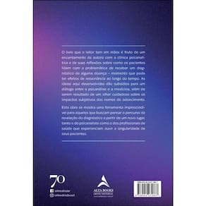 O livro que o leitor tem em mãos é fruto de um encantamento da autora com a clínica psicanalítica e de suas reflexões sobre como os pacientes lidam com a problemática de receber um diagnóstico de alguma doença – momento que pode ter efeitos de ressonância ao longo do tempo. As ideias aqui desenvolvidas dão subsídios para um diálogo entre a psicanálise e a medicina, além de serem resultado de um olhar cuidadoso sobre os impactos subjetivos dos nomes do adoecimento. Esta obra se mostra uma ferramenta imprescindível para aqueles que buscam pensar o percurso da revelação do diagnóstico a partir de um novo lugar, tanto o do psicanalista como o dos profissionais de saúde que experienciam ouvir a singularidade de seus pacientes.