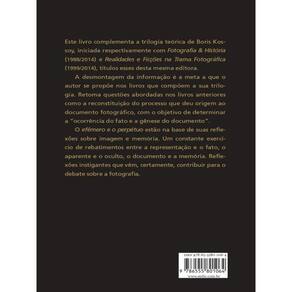 Este livro complementa a trilogia teórica de Boris Kossoy, iniciada respectivamente com Fotografia & História (1988/2014) e Realidades e Ficções na Trama Fotográfica (1999/2014), títulos esses desta mesma editora. A desmontagem da informação é a meta a que o autor se propõe nos livros que compõem a sua trilogia. Retoma questões abordadas nos livros anteriores como a reconstituição do processo que deu origem ao documento fotográfico, com o objetivo de determinar a “ocorrência do fato e a gênese do documento”. O efêmero e o perpétuo estão na base de suas reflexões sobre imagem e memória. Um constante exercício de rebatimentos entre a representação e o fato, o aparente e o oculto, o documento e a memória. Reflexões instigantes que vêm, certamente, contribuir para o debate sobre a fotografia.