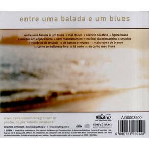 Entre uma Balada e um Blues é o título deste álbum excepcional de inéditas de Oswaldo Montenegro, o 25º de sua carreira. Com produção de Roberto Menescal, o repertório traz 14 faixas, quase todas assinadas apenas pelo cantor, no melhor de seu estilo. Destaques para No Final da Brincadeira, Mistérios do Mundo e Eu Canto Meu Blues. Marca: Não Informado