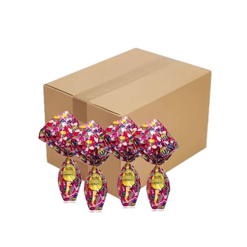 Caixa com 48 unidades de ovos de páscoa Emília com 45 gramas cada.