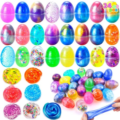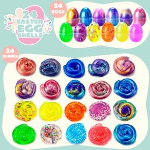 - Pacote supereconômico. Nosso suprimento de festa de Páscoa inclui 24 peças de ovos de Páscoa multicoloridos misturados com figura, fatias de frutas, contas e assim por diante. Eles vêm com 12 ovos de geleca multicoloridos e 12 unidades de ovos de geleca de galáxia. Cada ovo mede 6 cm.